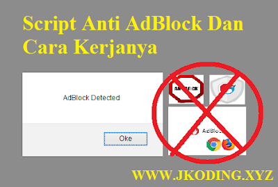 Script Anti AdBlock adalah sebuah kode javascript yang berfungsi untuk mendeteksi apakah pengunjung website menggunakan extension Adblock (di chrome) atau pengaya Adblock (di Firefox) di sebuah browser. Jika ternyata di browser pengunjung terdeteksi memakai extension/pengaya Adblock, maka Script Anti AdBlock akan menjalankan perintah untuk mematikan atau menon-aktifkan extension/pengaya Adblock tersebut. Perintah yang di tulis dalam kode Script Anti AdBlock biasanya merupakan sebuah fungsi untuk menampilkan sebuah pop up berisikan DOM HTML tertentu.Extension atau Pengaya Adblock merupakan sebuah addon yang terdapat pada sebuah browser untuk memblokir iklan yang tampil pada sebuah halaman website. Jika pengunjung memakai extension/pengaya Adblock, maka penghasilan sebuah website akan menurun karena tidak tampilnya iklan pada halaman website tersebut. Hal ini tentu saja membuat kita sebagai pembuat konten akan merasa dirugikan. Oleh karena itu, disini saya akan menjelaskan cara kerja atau konsep dasar cara kerja script Anti AdBlock. Sebelum memahami cara kerja Script Anti AdBlock, sebaiknya kita memahami terlebih dahulu bagaimana cara kerja Extension atau Pengaya Adblock itu sendiri.